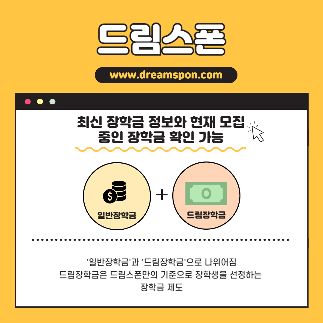 교외 장학금을 소개하는 '일반장학금', 드림스폰만의 기준으로 장학생을 뽑는 '드림장학금'으로 나누어져 있다. 그리고 현재 진행 중인 장학금과 마감 기한을 확인할 수 있다.