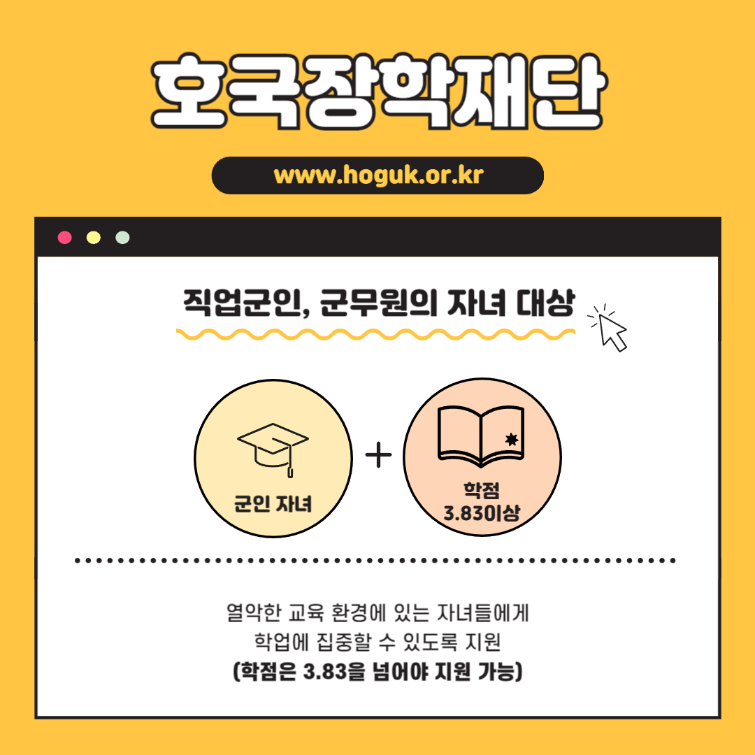 직업군인·군무원의 자녀들이 열악한 교육 환경을 극복하고 학업에 집중하여 국가의 미래 인재로 성장하도록 지원한다. 학점은 3.83을 넘어야 지원이 가능하다.