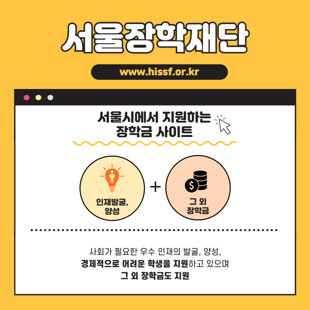 서울시에서 지원하는 장학금 사이트. 사회가 필요한 우수인재의 발굴, 양성, 경제적으로 어려운 학생 지원 등 제공하고 있으며 그 외 장학금도 지원하고 있다.