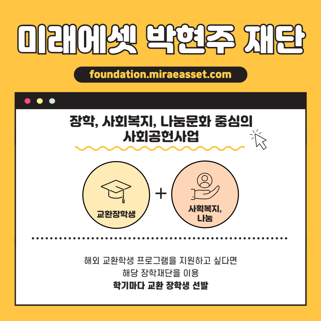 '미래에셋은 젊은이의 희망이 되겠습니다'라는 비전으로 장학, 사회복지, 나눔문화 중심의 사회공헌사업을 하고 있으며, 해외 교환 프로그램을 지원하고 싶다면 해당 장학 재단을 이용해 보면 좋다. 학기마다 교환 장학생을 선발하고 있다.