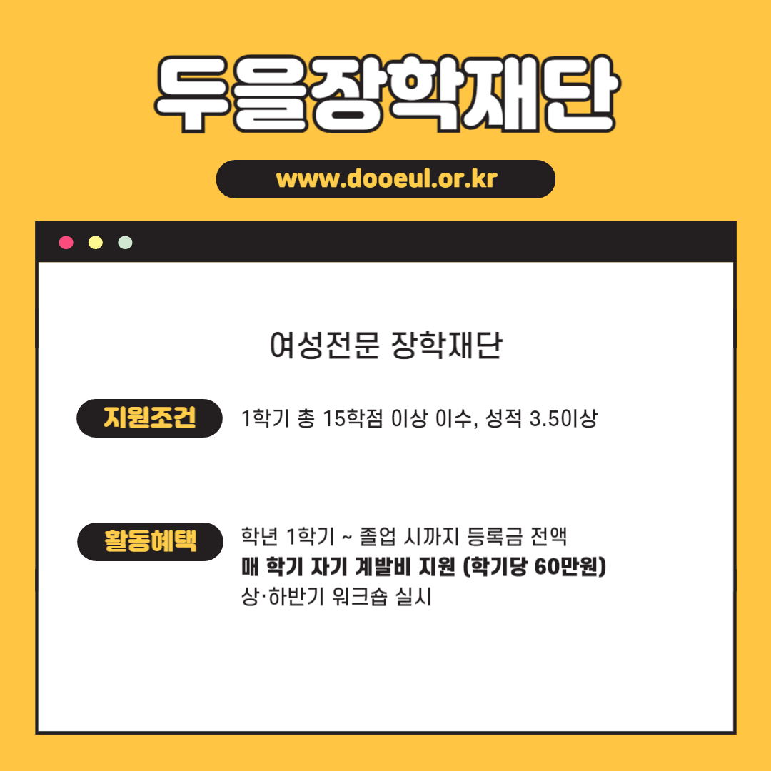 두을장학재단은 삼성그룹의 창업주 故이병철 선대회장을 내조하셨던 故박두을 여사의 유지를 받들어 한솔, 삼성, CJ, 신세계로 분사한 자녀들이 함께 참여하여 만든 장학재단입니다. 어려운 환경을 극복하고 미래의 여성지도자를 꿈꾸는 우수한 여성인재들을 발굴하는 국내 최초의 육성형 여성장학재단입니다. 학생들의 재능을 응원하고 미래를 활짝 열어 주기 위해 매년 16개 대학 1학년 여대생을 대상으로 졸업까지 등록금 전액과 자기 계발비를 지원합니다.