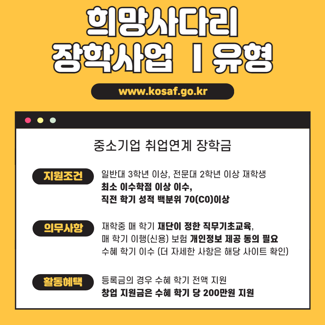희망사다리장학금은 다른 장학금에 비해 요구하는 서류가 많지 않고, 소득분위를 보지 않고, 무엇보다도 지원 규모가 훌륭합니다. 본인이 중소기업에 취업하고자 한다면 안 받을 이유가 없다시피 한 장학금입니다. 장학금을 신청하려면 준비해야 하는 서류가 많아서 여기저기를 다니며 추천서를 받고, 서명을 받고 해야 하는 일이 많은데 희망사다리장학금은 컴퓨터로 서류만 작성해서 제출하면 됩니다. 게다가 소득분위를 보지 않는 장학금은 거의 없다시피 한데, 희망사다리장학금은 소득분위를 전혀 보지 않습니다. 이렇게 좋은 장학금인데 지원해 주는 액수가 정말 훌륭하다고 생각합니다. 등록금 전액에 200만 원까지 얹어서 줍니다. 이렇게 본인이 중소기업에 취업하거나 창업을 희망하기만 한다면 쏠쏠한 장학금입니다.
