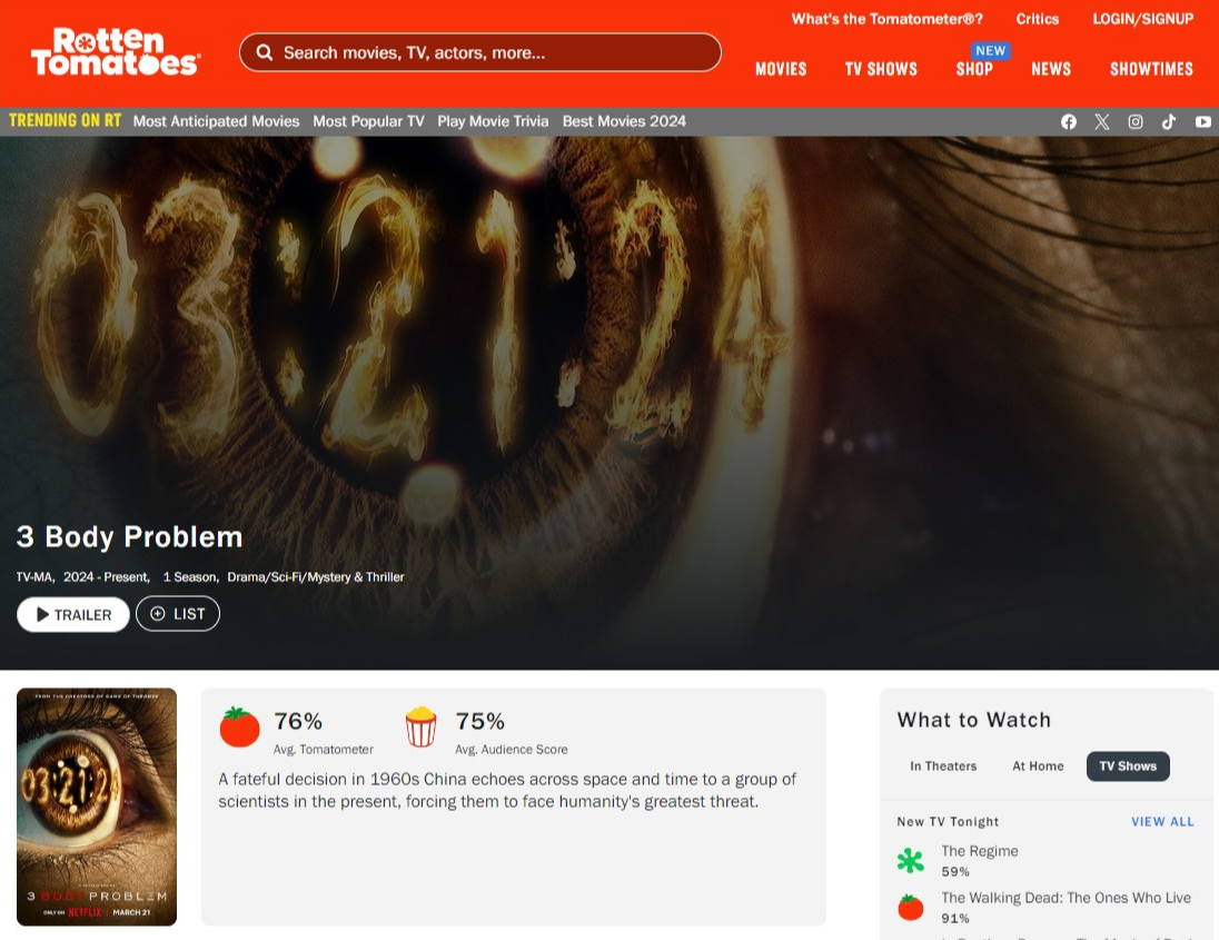 로튼 토마토에서의 삼체 넷플릭스 평점은 신선도 76%에 팝콘지수 75%로 나름 평타를 치고 있다.