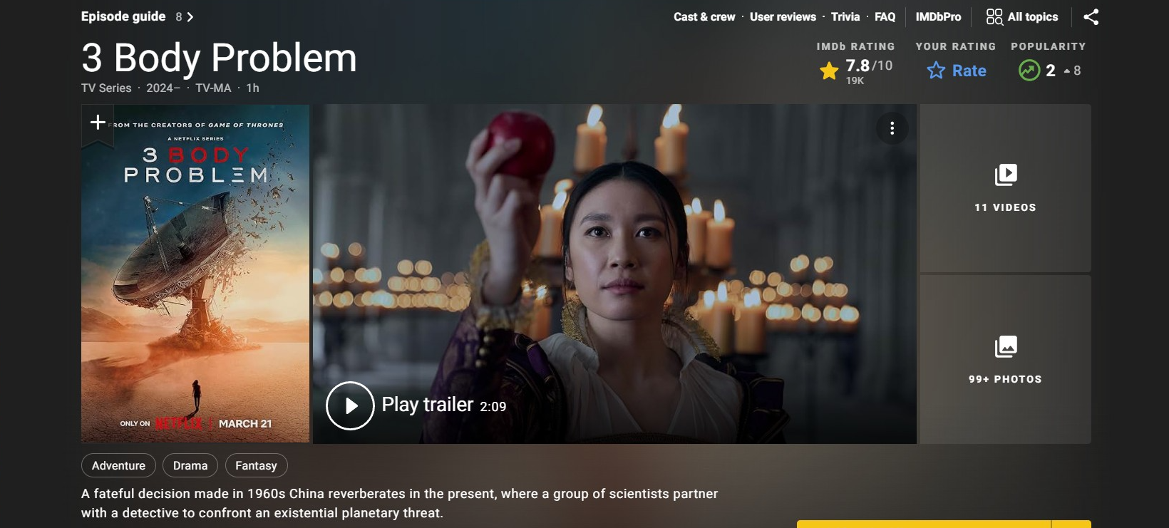 지금 3월 25일 기준으로의 삼체 평점은 몇 점일까? 먼저 IMDb에 들어가서 살펴보니 10점 만점에 7.8점을 받고 있다.