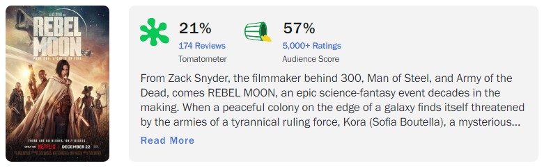 2시간 15분의 다소 긴 러닝타임을 가진 레벨문. 레벨문은 잭 스나이더가 3개의 파트로 나눠서 공개할 예정이라고 한다. 파트 1은 주인공 코라가 드래곤볼을 모으러 다니듯 자신과 함께 싸워줄 동료들을 모으는 내용이 전개되며 뜻하지 않은 상황에 처하게 되며 위기를 겪게 된다. 일단 레벨문을 다 본 소감은 잭 스나이더가 그동안 자신이 만들어온 작품을 여기다 쏟아 부은거 같다는 느낌이다. 영화를 보면서 300도 느껴지고 아미오브데스도 느껴지고 저스티스리그의 모습도 보였다. 새롭고 광대한 세계관에서 CG로 구현되는 캐릭터들과 세상은 꽤나 매력적으로 보였다. 특히나 네메시스 역을 맡은 배두나의 스타일과 그녀가 보여주는 광선검 액션은 스타워즈 광선검에 대한 로망을 가지고 있는 마니아들을 열광케 할 것 같다는 생각도 들었다. 다만 전반적으로 레벨문 파트 1에 대해 받은 인상은 내용전개는 별로 된 것이 없다는 것이다. 주인공인 영웅들을 모으는 내용이 전개되었지만 각각의 서사는 대사로 지나가버리기 때문에 결과적으로 굉장히 짧은 내용을 긴 시간에 걸쳐서 본 것 같은 느낌이 들었다. 하지만 캐릭터들과 액션 CG가 너무 안타까웠다. 생각에는 이걸 무리하게 영화로 만들 것이 아니라 시리즈로 제작해서 각 인물의 서사를 좀 본격적으로 파고들면서 웅장한 스페이스 오페라를 제대로 다뤘으면 어땠을까 싶다.