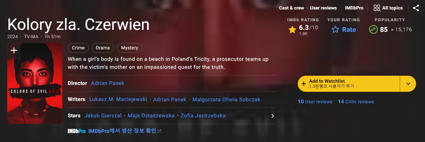 청렴하고 강직한 검사 빌스키와 죽은 딸의 진실을 찾기 위해 노력하는 헬레나의 이야기는 보는 내내 긴장감을 놓을 수 없게 만듭니다. 비록 평점은 높지 않지만, 유럽 특유의 분위기와 반전이 있는 범죄 스릴러를 좋아하는 분들에게는 충분히 매력적인 작품이 될 것입니다. 유럽 범죄 스릴러의 색다른 매력을 느끼고 싶다면, <악의 색깔: 레드>를 꼭 한번 시청해 보세요.