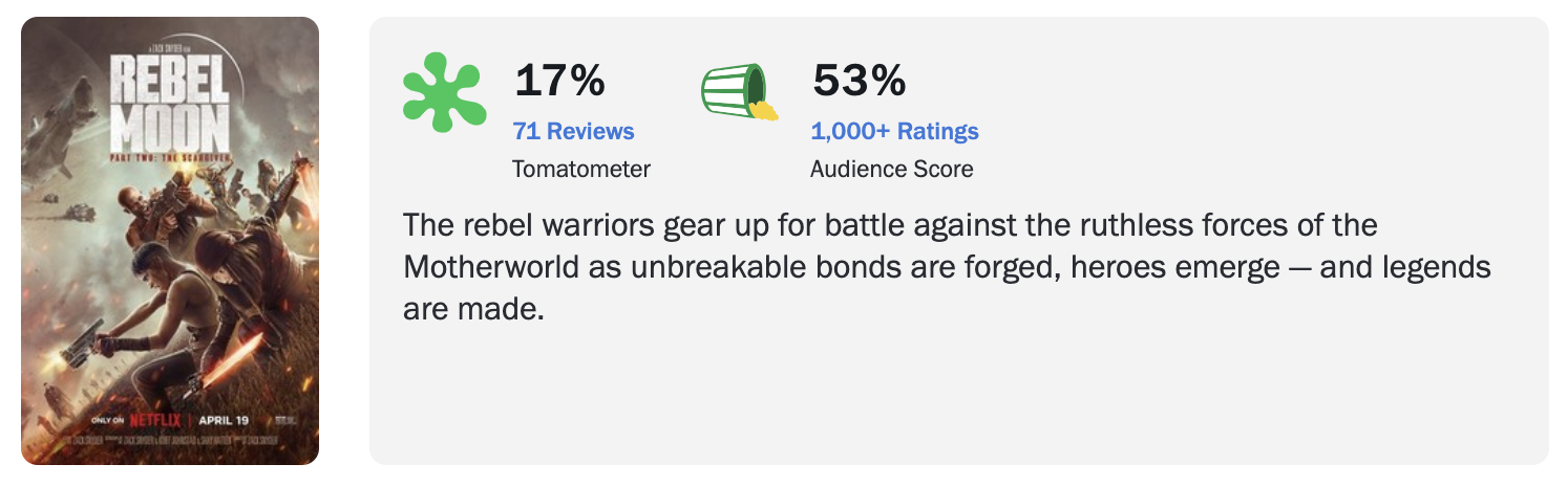 IMDB 지수는 10점 만점에 5.1점, 로튼토마토 신선도 지수는 17% 관객지수는 42%를 나타내고 있다.