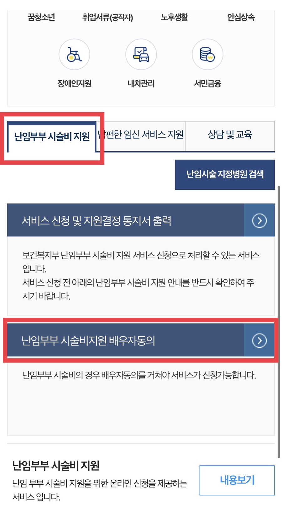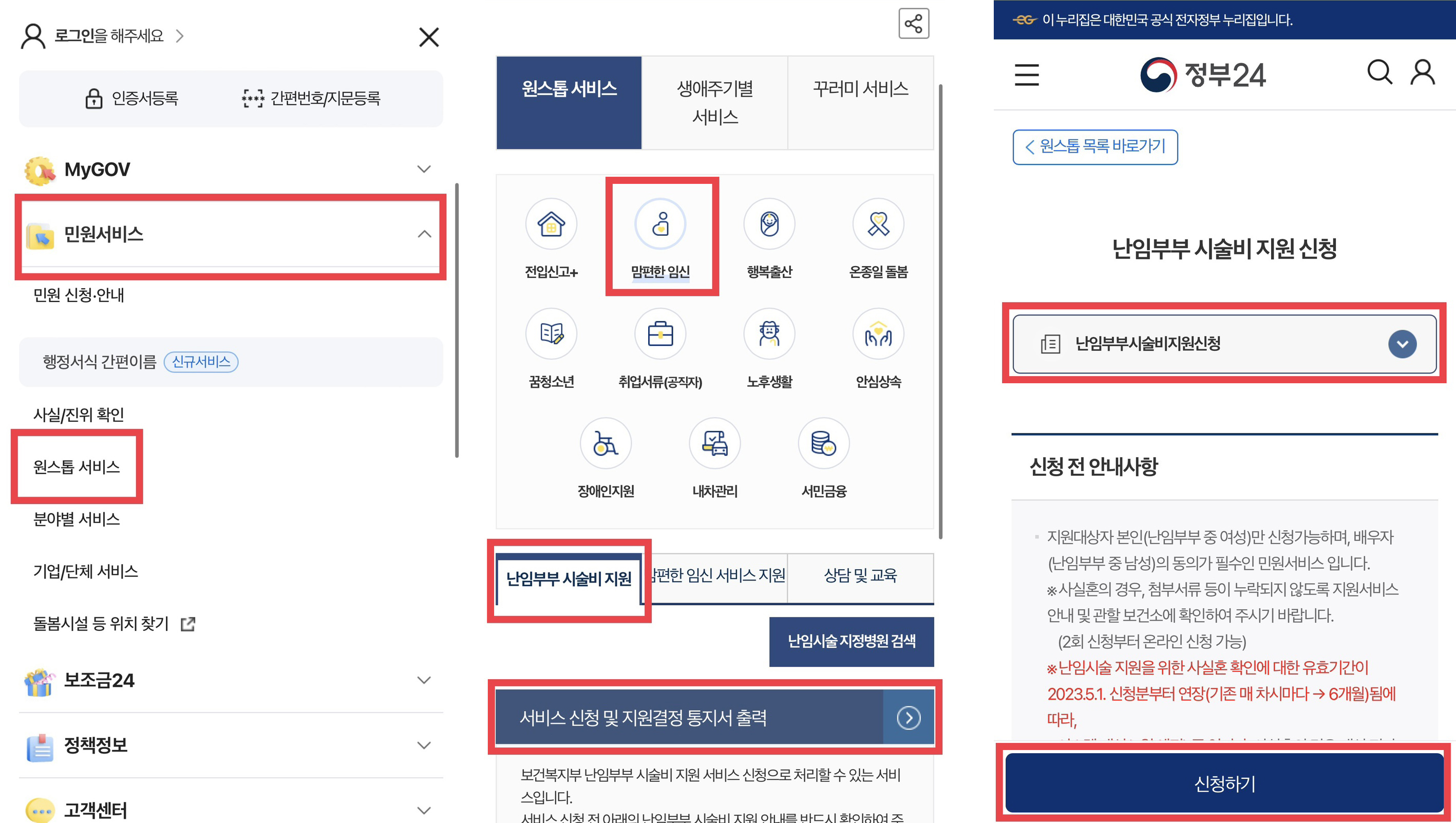 1. 정부24 > 민원 서비스 > 원스톱 서비스 > 맘 편한 임신 > 난임부부 시술비 지원 신청 클릭