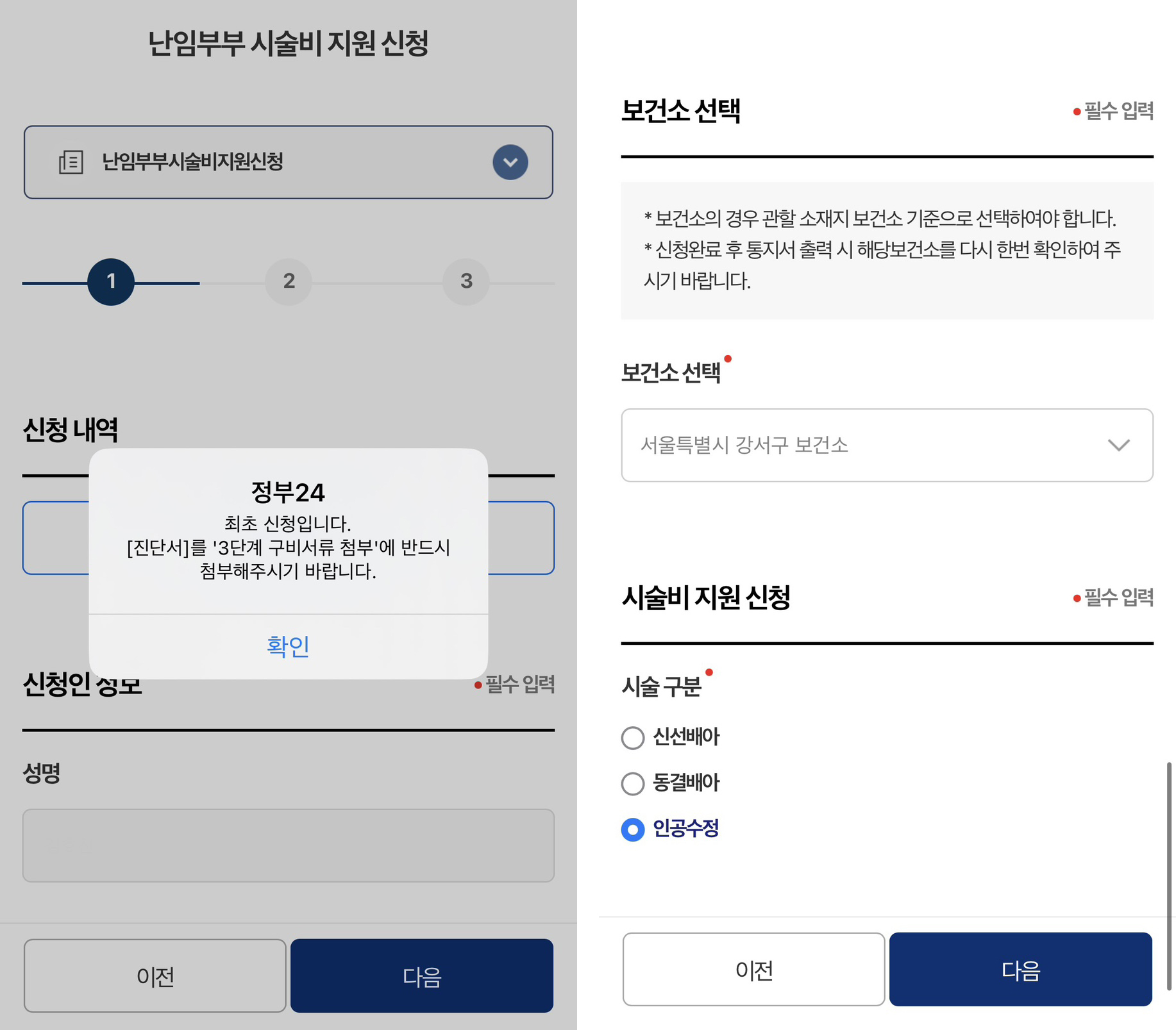 - 신청은 매 차수마다 해야 하며, 인공수정에서 시험관 넘어갈때에는 체외수정 진단서가 필요하다.