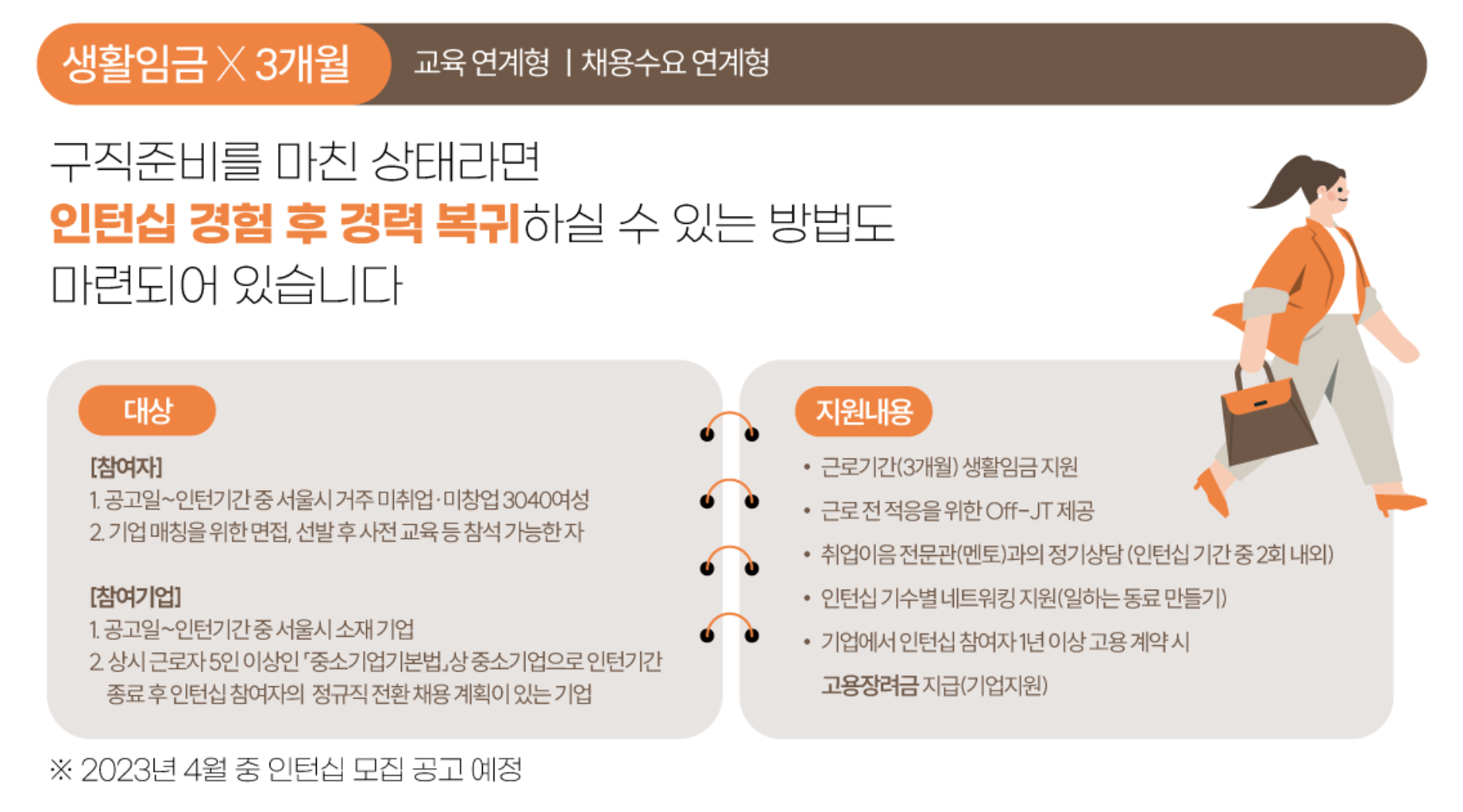 지원대상 : 서울시에 거주 중인 3040의 미취업 여성이 대상이다. 인턴십 프로그램별 세부 조건은 상이하다. (직무관련 직업훈련교육프로그램 이수, 자격증 보요 여부 등)