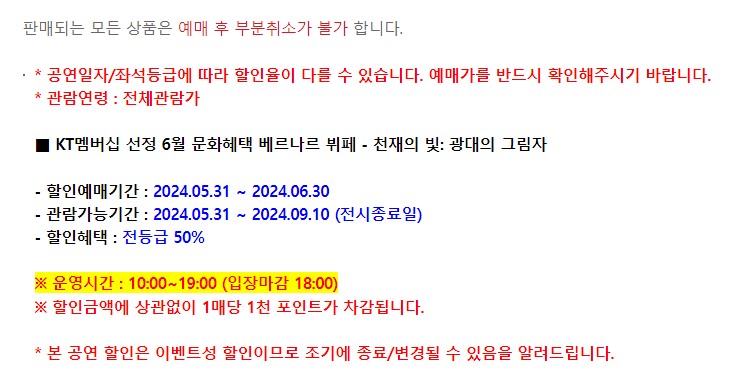 - KT멤버십 할인 예매 기간 : 2024년 5월 31일(금) ~ 6월 30일(일)
