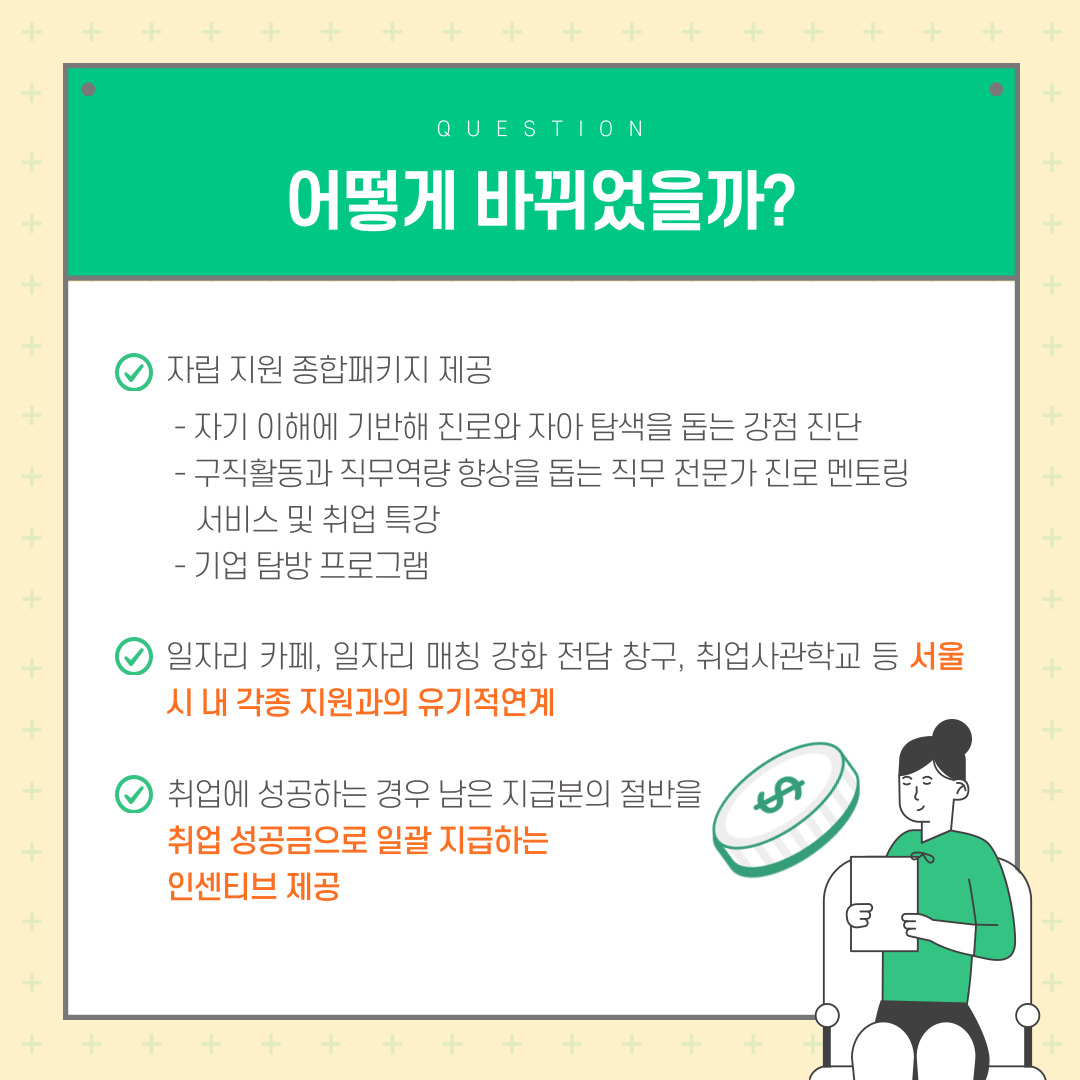 ▶ 비금전적 지원 : 전문가 진로상당, 취업 멘토링 특강 등 맞춤형 청년 프로그램 제공