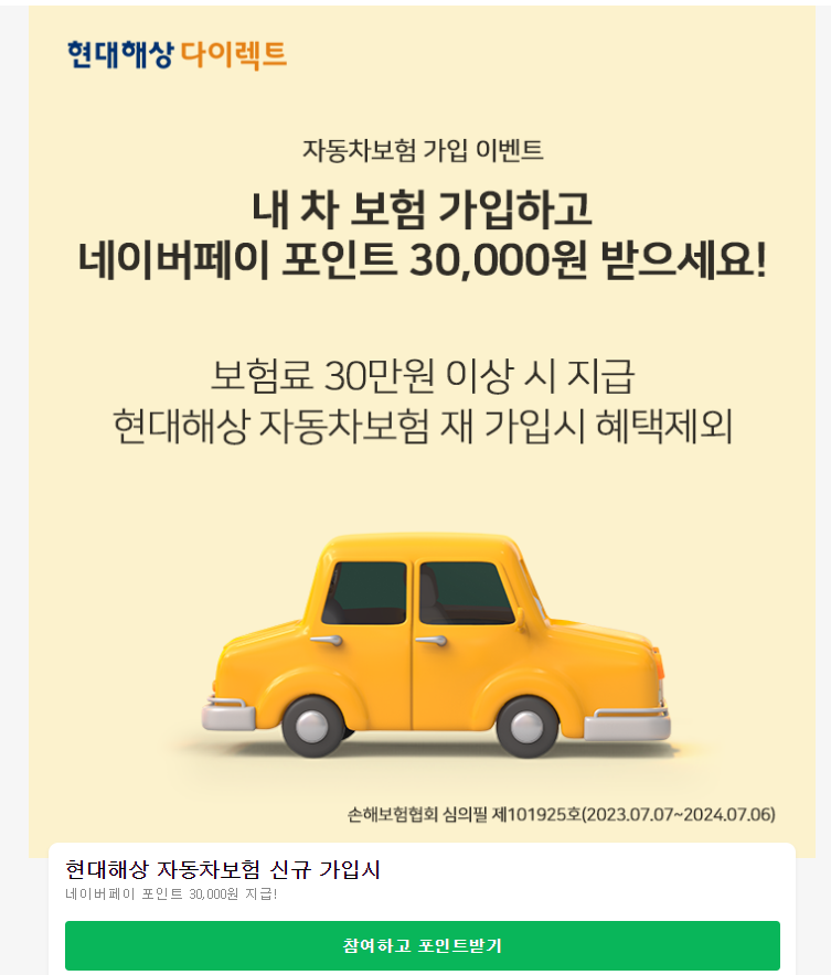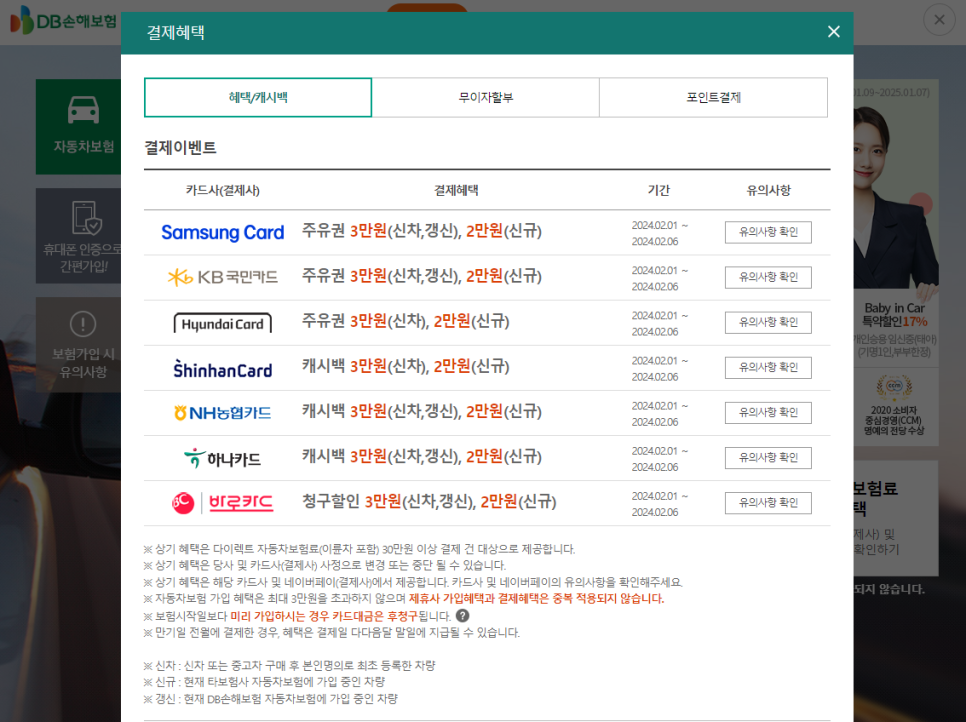 *가입 이벤트의 경우도 보험료산출이벤트와 동일하게 기존 가입고객(동일 보험사에서 갱신)의 경우엔 해당되지 않는 경우가 많다. 동일 보험사로의 갱신을 원할 경우 보험사의 이벤트나 혜택페이지를 통해 갱신자 대상 이벤트를 확인하면 된다.