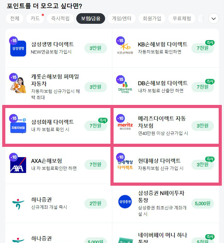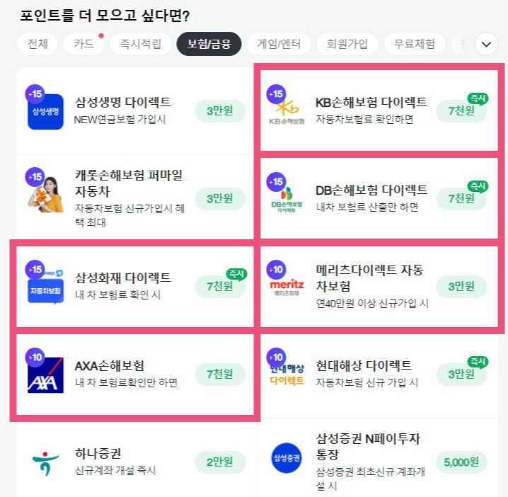 클릭하면 이벤트 페이지가 뜨는데 참여하고 포인트 받기 버튼을 누르면 해당 보험사의 보험 가입 페이지로 이동한다.