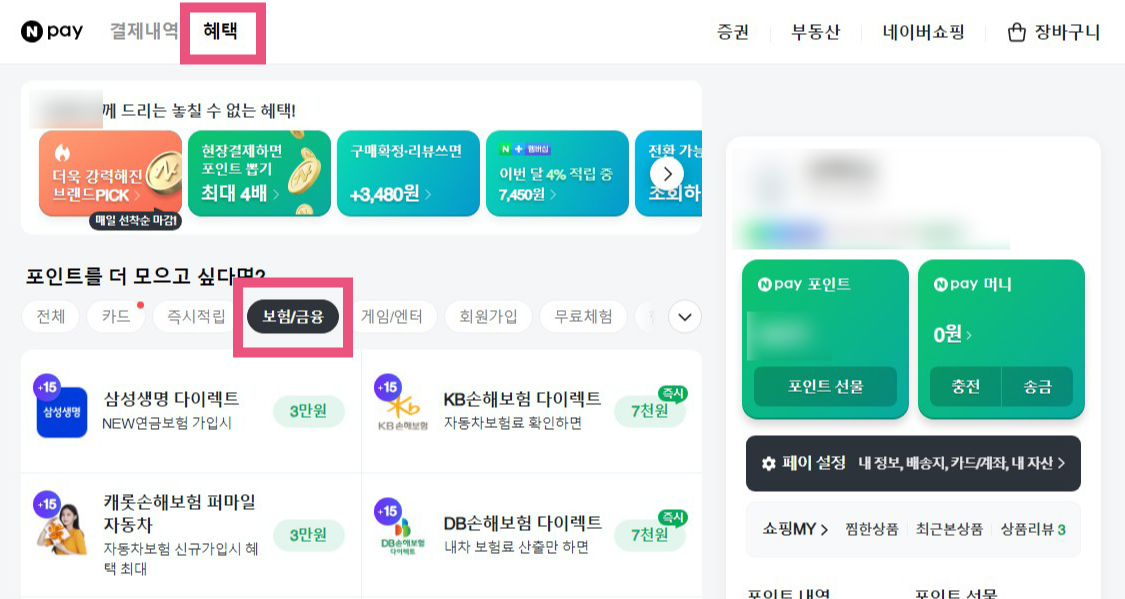 보험료 산정이 완료되었다고 바로 가입하는 것이 아니라, 다시 네이버 페이의 혜택 페이지로 돌아온다.