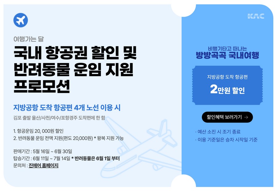국내 항공을 이용하는 여행자들을 위해 특별한 할인 혜택과 반려동물 운임 지원 프로모션이 준비되어 있습니다.