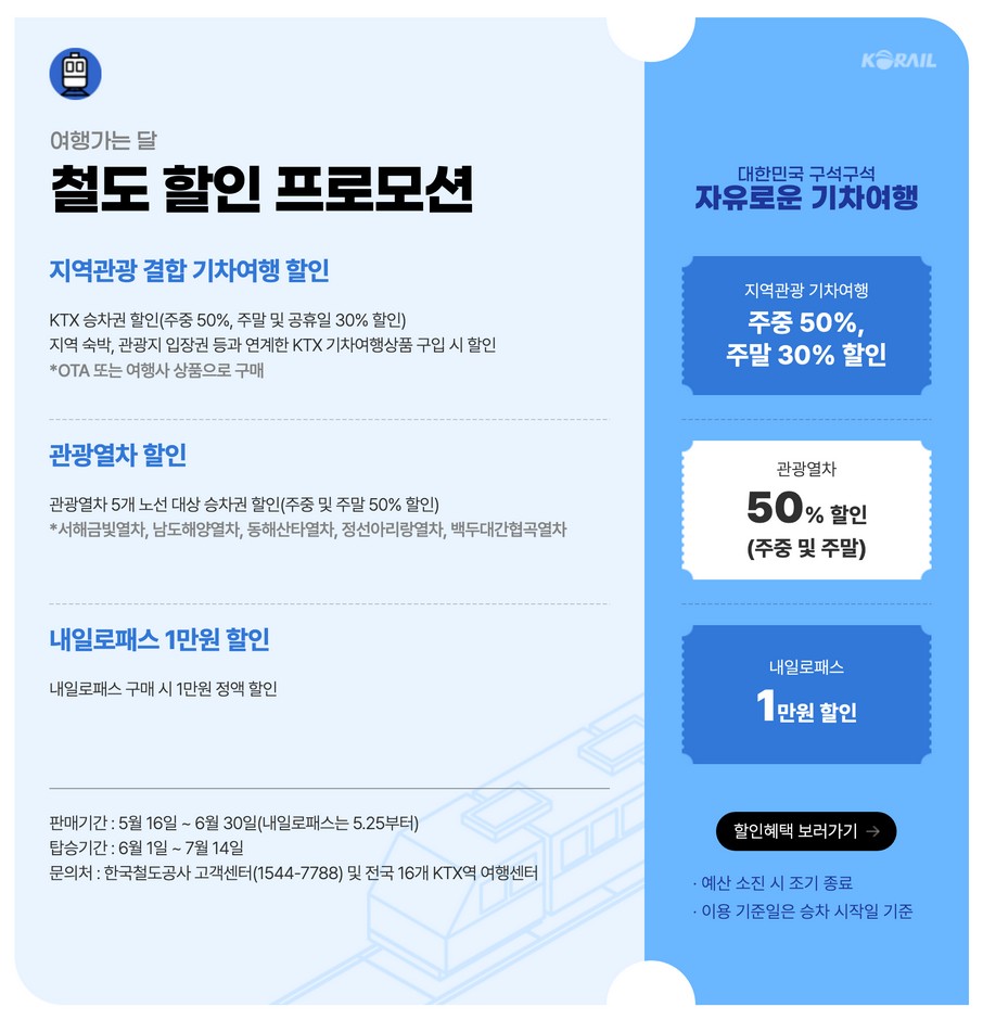 - 판매기간 : 5월 16일부터 6월 30일까지(내일로 패스는 5월 25일부터 판매 시작)