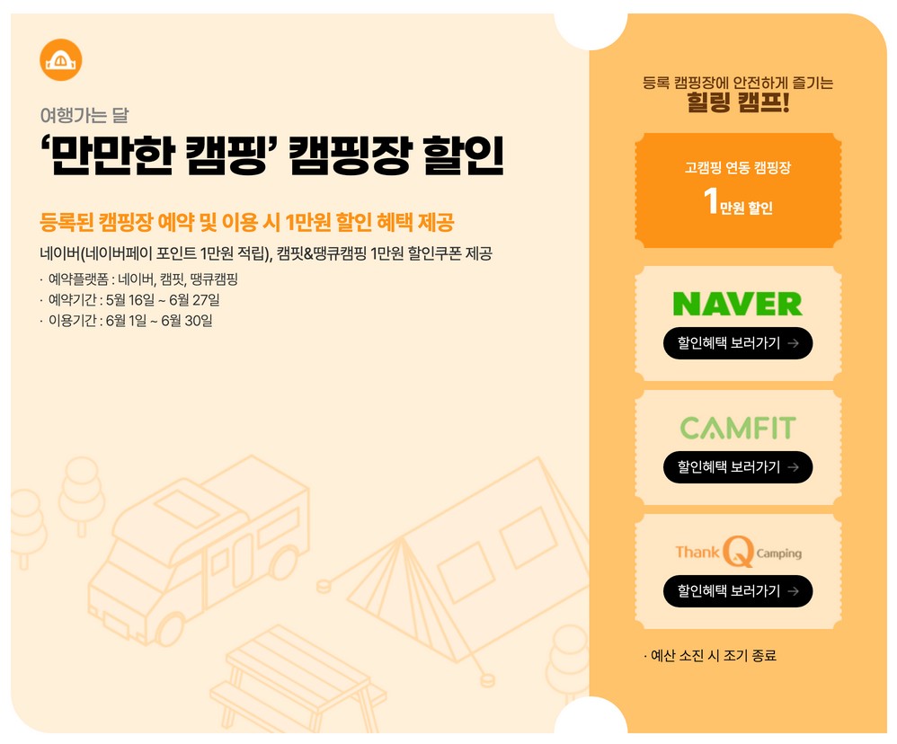 - 할인혜택 : 등록된 캠핑장 예약 시 1만 원 할인