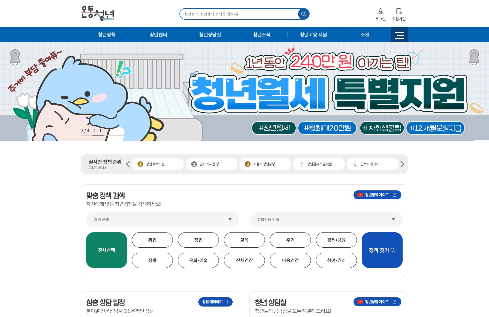 온통청년은 청년들을 위한 포털 사이트로, 취업, 창업, 교육 등 다양한 분야에서 지원을 제공합니다. 청년정책에 대한 체계적, 통합적인 정보망 구축과 전문성 있는 안내 및 상담까지 온, 오프라인으로 지원해 주는 청년을 향한 공간입니다.