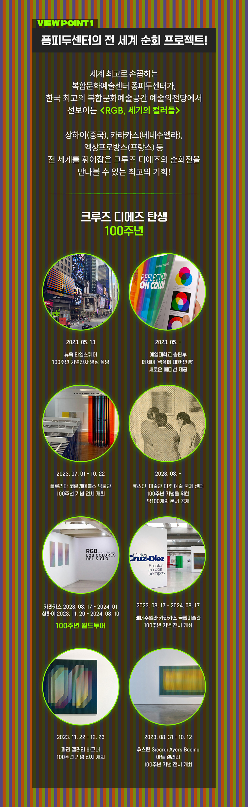 이번 전시는 세계적으로 유명한 퐁피두센터와 크루즈 디에즈 재단의 협력으로 진행되며, 카를로스 크루즈 디에즈가 생전에 고안한 특별 프로젝트 <RGB, THE COLOR OF THE CENTURY>의 한국 전시입니다. 예술 속 색채에 대한 새로운 이해를 제안하며 그 지각의 범위를 확장시킨 크루즈 디에즈의 작품들을 통해 색채와 빛의 원리를 과학적으로 분석하고 연구해 온 자취를 따라가 보는 체험형 전시입니다.