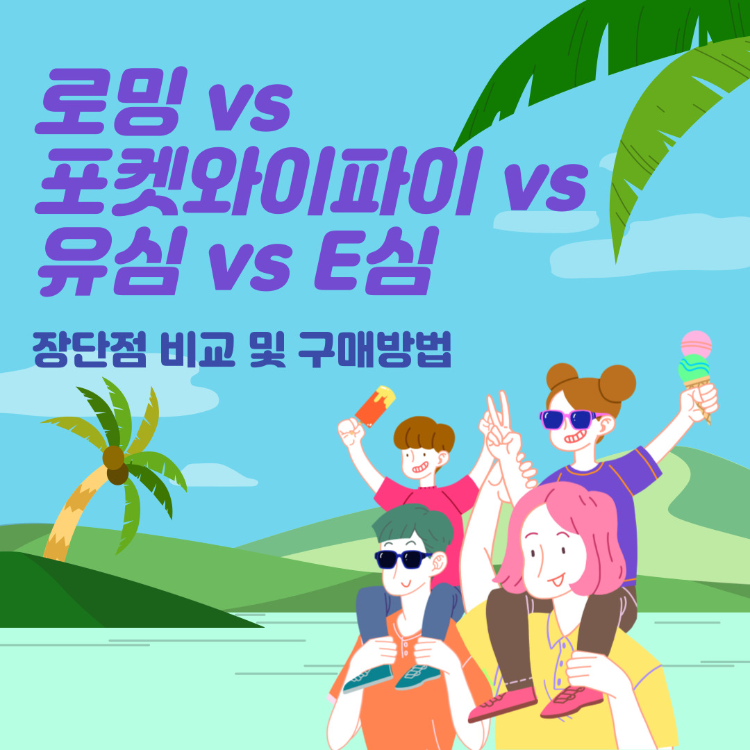 해외여행 준비물 중 항상 고민되는 것, 해외여행에서 데이터 사용에 관한 포켓 와이파이를 할지, 유심을 구매할지, E 심을 구매할지이다. 이럴 때 필요한 건 나에게 필요한 것은 어떤 것인지 비교해 보고 적당한 것으로 선택하는 것이 중요하다. 해외 데이터 사용은 크게 로밍, 와이파이, 유심으로 구분된다.