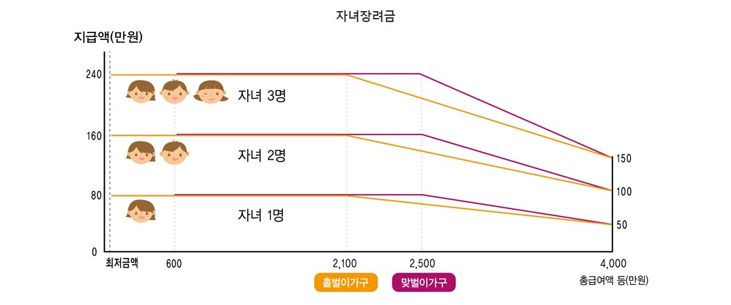 | 홑벌이 | 2,100만 원 미만 | 자녀 1인당 80만 원 |