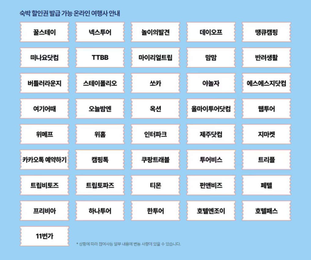 - 할인혜택 : 7만원 이상 국내 숙박상품 예약 시 3만 원, 7만 원 미만 숙박상품 예약 시 2만 원 할인